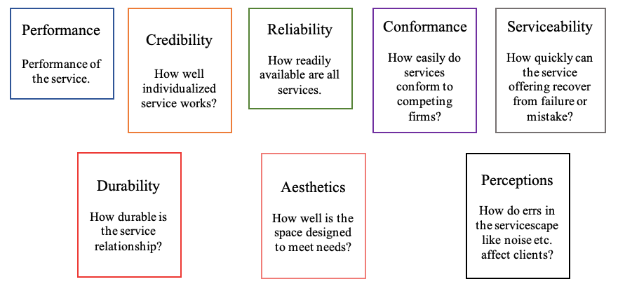 David Garvin (1987) who is a respected figure in Service Quality, avoids the use of standard frameworks like ISO but instead suggests that Quality is comprised of eight metrics. I have adapted this framework specifically to suit small firms operating in launchpads as follows: